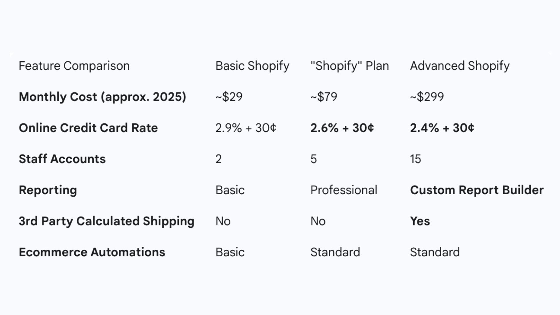 This table provides a clear overview of the key differences in the core Shopify Pricing and plans.